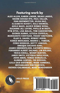 Featuring work by Alex Allen, Karen Linder, Brian Landis, Naomi Shihab Nye, Paul Haller, Ivan BrownOtter, Hilda Raz, Elizabeth Schott, Kelli Grinich,Adele Maze, Alexis Gomez Rosa, Suzanne Jill Levine, Phyllis M Skoy, Kym Sites, Lisa Malul, Tom Harrington, George Burns, Letizia Coppola, Marguerite Costigan, Friday Gretchen, Olav H. Hauge, Robert Hedin, Kobus Moolman, Marnie L. Parker, Corn Goddess, Dotty LeMieux, Enrique Sacerio-Gari, Jeanie Greensfelder, Kathryn Ridall, Fernando Albert Salinas, Lin Rolens, Tricia Knoll, Wendy Burton, Jared Smith, Victoria Sepulveda, John Amen, Tomás González, Glenna Luschei, Ted Kooser, Leila Said Gutowski, Mark Sanders, Michaelann Dimitrijevich, George Kalamaras, and Mary Winegarden.